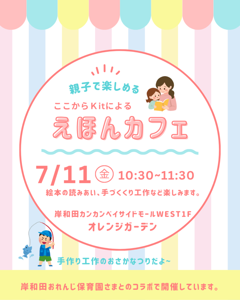 5月から毎月第2火曜日に岸和田カンカンベイサイドモールWESTで開催していましたが、諸事情でカンカン1階にある企業型保育園「おれんじ保育園」さんのオレンジガーデンのお部屋を使用させていただくことになりました。本当にありがとうございます。